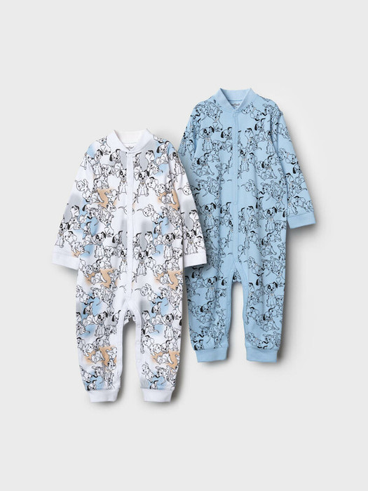 Комбинезон для новорожденного мальчика. Набор из 2 штук. Один — с ярким принтом на белом фоне с голубыми и бежевыми акцентами, второй — однотонный голубой с рисунками щенков. Модель с длинными рукавами и манжетами на запястьях и щиколотках, застегивается спереди на кнопки, проходящие до низа. Изготовлен из мягкого хлопкового трикотажного полотна — интерлока.