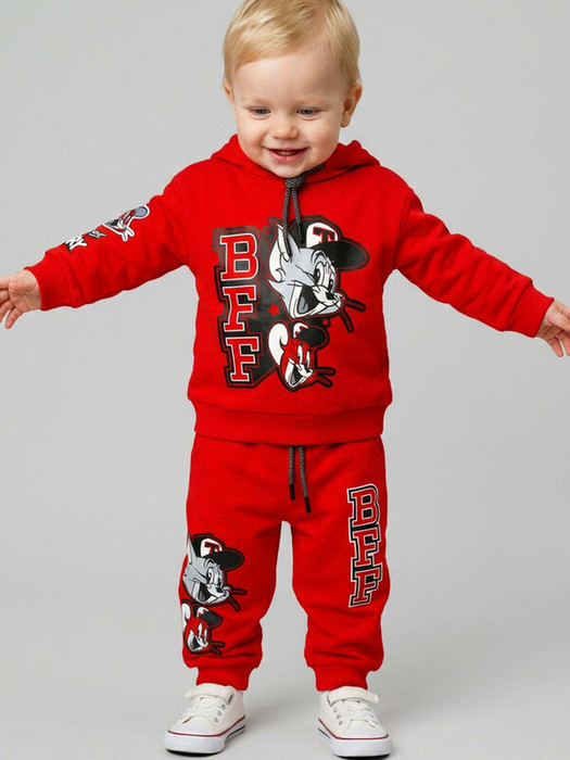 Детский спортивный костюм для мальчика. Комплект выполнен из хлопкового футера и состоит из худи и джогеров на резинке. Толстовка свободного кроя с красочным принтом. Манжеты и пояс выполнены из эластичного риба, благодаря чему изделие хорошо держит форму. Брюки джоггеры — комфортные, с эластичным поясом и шнуром для регулировки посадки. Низ штанин собран на резинку.