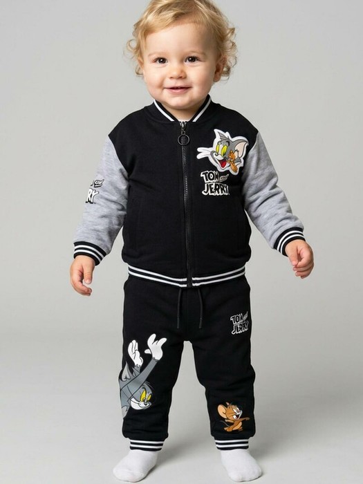 Детский спортивный костюм для мальчика. Комплект выполнен из хлопкового футера и состоит из толстовки на молнии и джогеров на резинке. Толстовка прямого кроя с красочным принтом любимых героев Том и Джерри. Боковые карманы. Манжеты и пояс выполнены из эластичного риба, благодаря чему изделие хорошо держит форму. Брюки джоггеры — комфортные, с эластичным поясом и шнуром для регулировки посадки. Удобные боковые карманы. Низ штанин собран на резинку.
