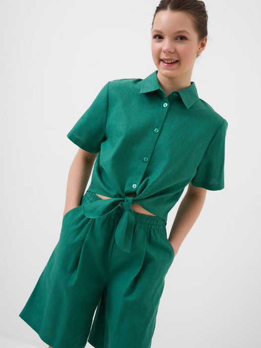 Легкий льняной костюм для девочки подростка. Рубашка прямого кроя с коротким рукавом и застежкой на пуговицы. Классический воротник, укороченная длина с завязками на талии. Свободные шорты на резинке со шнурком для регулировки. Удобные боковые карманы.