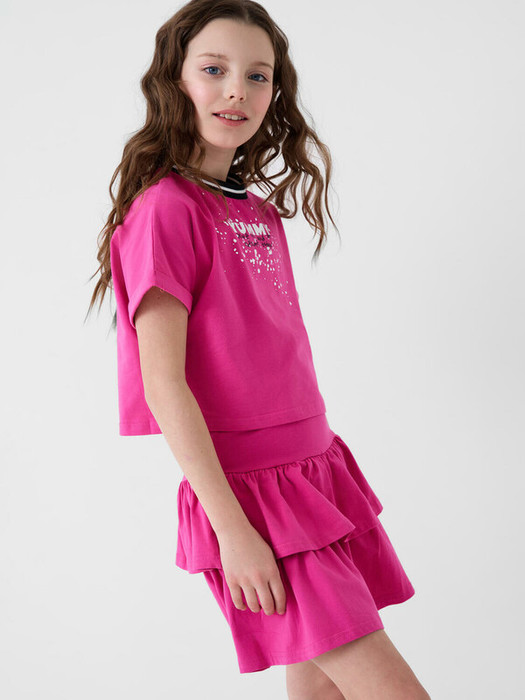 Легкий комплект для девочки подростка. Выполнен из мягкого хлопкового трикотажа джерси, состоящий из укороченной футболки и юбки-шорт. Футболка свободного кроя с ярким принтом. Пышная юбка на резинке с воланами, внутри имеет удобные шорты, что делает модель практичной для активного отдыха.