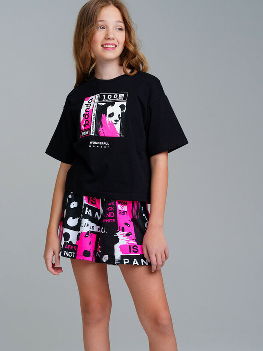Комплект трикотажный: укороченная футболка, шорты. Футболка силуэта oversize. Высокое содержание хлопка. Благодаря наличию эластана в составе ткани изделие проще в уходе и держит форму. Принт сохраняет первоначальный вид даже после многочисленных стирок. Оптимальная посадка: шорты не сползают при движении. Эластичный пояс со шнурком.