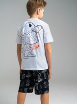 Комплект: футболка, шорты из качественного и приятного на ощупь трикотажа джерси. Высокое содержание хлопка 95%. Благодаря наличию эластана в составе ткани изделие проще в уходе и держит форму. Эластичный пояс со шнурком. Оптимальная посадка: шорты не сползают при движении.