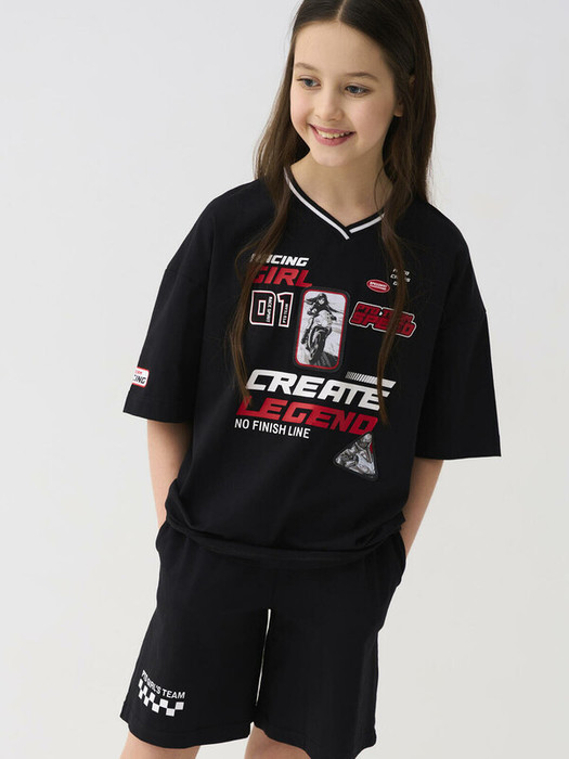 Стильный костюм для девочки подростка. Состоит из футболки с коротким рукавом и шорт. Выполнен из хлопкового трикотажа. Футболка оверсайз с красочным принтом в гоночной тематике. Шорты свободные, хорошо сидят на талии благодаря эластичному поясу. Удобные боковые карманы.