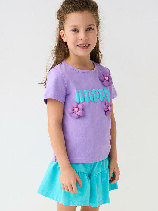 Детский костюм для девочки. Состоит из футболки с коротким рукавом и шорт. Выполнен из хлопкового трикотажа. Футболка прямого кроя, с красочным принтом и объемными цветами. Шорты свободные, хорошо сидят на талии благодаря эластичному поясу.