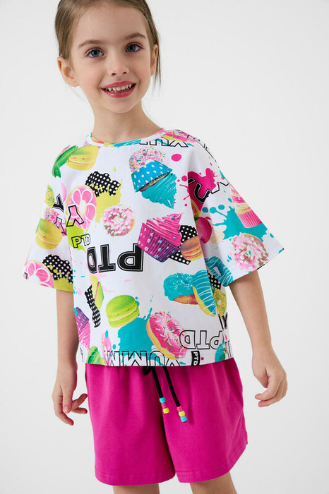 Детский костюм для девочки. Состоит из футболки с коротким рукавом и шорт. Выполнен из хлопкового трикотажа. Укороченная футболка оверсайз с красочным принтом. Шорты свободные, короткие, хорошо сидят на талии благодаря эластичному поясу и регулирующему шнурку. Удобные боковые карманы.