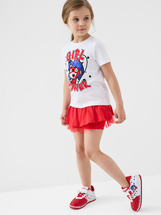 Легкий детский комплект для девочки. Выполнен из мягкого хлопкового трикотажа джерси, состоящий из футболки и юбки-шорт. Футболка прямого кроя с ярким принтом с любимым персонажем "Леди Баг и Супер-Кот". Пышная юбка на резинке со шнурком, украшена воланами и сеткой, внутри имеет удобные шорты, что делает модель практичной для активного отдыха.