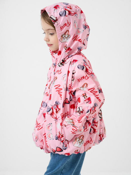 Ветровка детская для девочки. Температурный режим от +20С до +10С. Ткань с ветрозащитным и водоотталкивающим покрытием. Внутри трикотажная подкладка. Капюшон несъёмный на резинке. Два кармана на молнии. Внутренний карман на липучке. Манжеты и низ изделия на резинке.