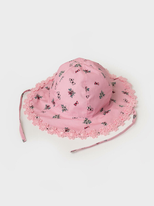 Детская панама для девочки. Модель выполнена в нежно-розовом цвете с красивым мелким рисунком — на ткани изображены цветочки, бантики и ягодки. Широкие поля украшены воланом, который по краю отделан кружевной тесьмой. Панама хорошо сидит на голове благодаря эластичной вставке на затылке и завязкам.
