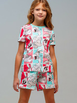 Пижама для девочки подростка. Футболка и шорты из эластичного и приятного на ощупь трикотажа. Шорты на резинке со шнурком. Высокое содержание хлопка 95%. Благодаря наличию эластана в составе ткани изделие держит форму и меньше мнется.