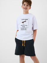 Пижама для мальчика подростка. Футболка оверсайз с короткими рукавами и круглым воротом оформлена крупным принтом на спинке с изображением скейтбордиста, а спереди — креативным принтом. Шорты имеют камуфляжный узор в чёрно-серой гамме и дополнены ярко-оранжевым декоративным шнурком в поясе. На шортах предусмотрены боковые карманы. Изделие выполнено из мягкого хлопкового трикотажа.