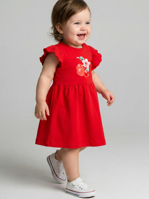 Лёгкое детское платье для девочки. Модель имеет свободный крой и среднюю длину — до колена. Платье выполнено из мягкого хлопкового трикотажа интерлок. Рукава в форме воланов добавляют образу воздушности, а принт с вишнями и цветком делает изделие особенно милым. Для удобства надевания на левом плече расположены кнопки.