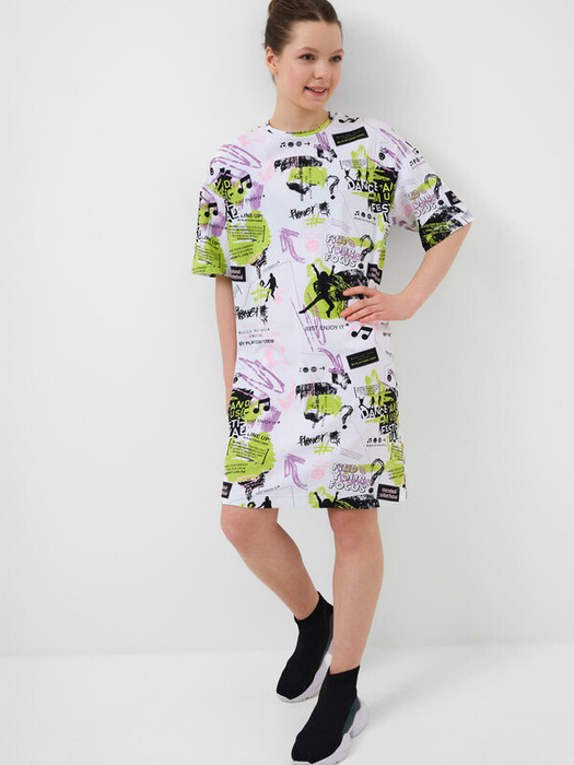 Платье-футболка оверсайз для девочки подростка. Модель длиной чуть выше колена, выполнена из хлопкового трикотажа джерси. Сзади декоративная нашивка. Яркие принты в стиле граффити.