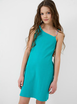 Платье для девочки подростка. Выполнено из мягкого хлопкового трикотажа в рубчик. Платье прямого силуэта, длиной до колена. Модель асимметричная: с одной стороны открытое плечо, с другой — тонкая декоративная лямка, украшенная яркими бусинами.