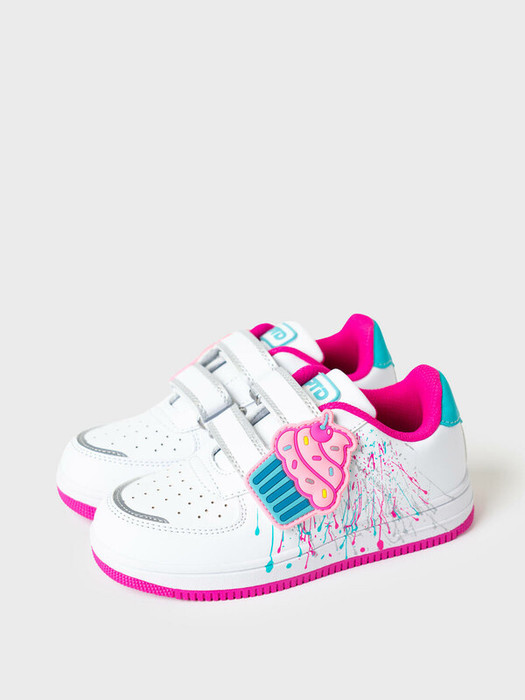 Оригинальные кеды для девочек на широкой липучке. Липучка декорирована крупным патчем - пироженкой.. Кроссовки выполнены из искусственной кожи, по своим свойствам схожим с натуральной кожей. В обуви есть светоотражающие элементы. В носочной части обуви стоит текстильная подкладка c высоким содержанием хлопка 80%, которая обладает высокой гигроскопичностью. В пяточной части обуви текстильная подкладка обладает хорошей износостойкостью. Профилированная съемная стелька из натуральной кожи с анатомической формой подсводника обеспечивает правильную нагрузку на стопу. Формоустойчивый задник поддерживает стопу в правильном положении. Эргономичная форма колодки обеспечивает правильное формирование стопы ребенка. Подошва из ТПР гибкая, не скользит и устойчива к истиранию.