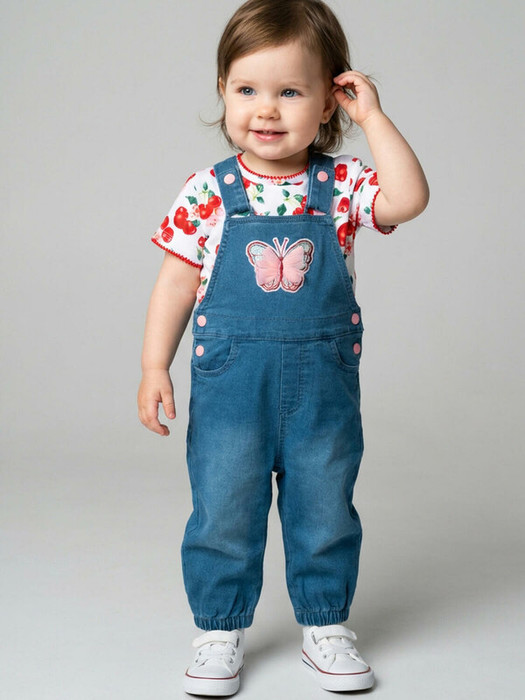 Детский джинсовый полукомбинезон для девочки. Модель на широких лямках, которые перекрещиваются на спине и застёгиваются на кнопки. По бокам и на лямках – розовые металлические кнопки. На груди — яркая аппликация в виде бабочки. Удобная посадка за счёт эластичной вставки на поясе. Спереди боковые карманы, сзади — накладные. Брючины собраны на резинку, что делает посадку комфортной.