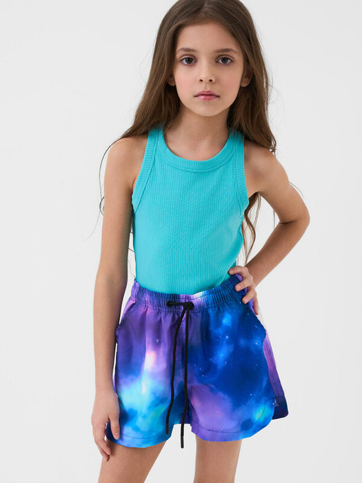 Плавательные шорты для девочки подростка. Шорты средней длины, выполнены из легкого, быстросохнущего материала с ярким космическим принтом. Удобный эластичный пояс дополнен шнуром для регулировки. Внутри предусмотрена мягкая сетчатая подкладка.