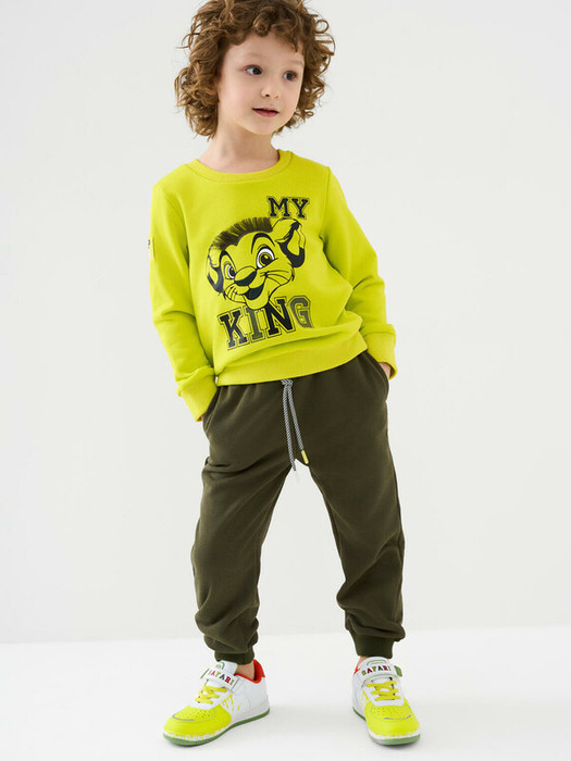 Свитшот детский для мальчика. Выполнен из хлопкового футера без начеса. Прямой крой. На груди — принт с героем из любимого мультфильма "Король Лев". На рукаве - объемная силиконовая нашивка. Манжеты и низ изделия выполнены из эластичного риба, что обеспечивает комфортную посадку.