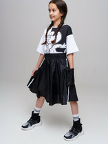 Детская юбка-леггинсы для девочки. Верхняя часть выполнена из легкой сетчатой ткани, под ней — плотные трикотажные укороченные леггинсы. Широкий пояс держится за счёт внутренней резинки. Длина юбки — до середины бедра.