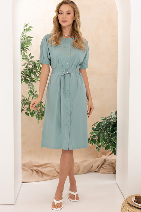 Платье свободного силуэта с разрезами в боковых швах из плательной ткани. На передней и задней части изделия выполнена кокетка. Круглый вырез горловины оформлен косой бейкой. Короткий втачной рукав в спущенную пройму. Нижняя часть рукава присборена на резинку. По центру передней части застёжка на кнопки. В комплекте пояс из основной ткани.