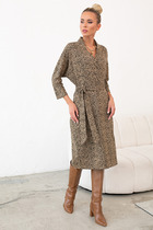 Платье из эластичного полотна с жаккардовым анималистичным узором. Изделие свободное в верхней части и прилегающее в области талии и бёдер. Лиф изделия оригинального кроя в стиле кимоно. Цельнокроеная стойка переходящая в запах, визуально делает фигуру стройнее. По центру задней части платья выполнен шов, снизу небольшой разрез. В комплекте пояс. В таблице размеров представлены параметры человека, а не изделия.