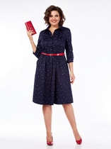 Платье приталенного силуэта из вискозной плательной ткани. Изделие отрезное по линии талии с защипами. В боковых швах карманы. Втачной короткий рукав. Притачная планка с застёжкой на пуговицы. Вырез горловины обработан отложным воротником на стойке. В комплекте пояс из основной ткани.
