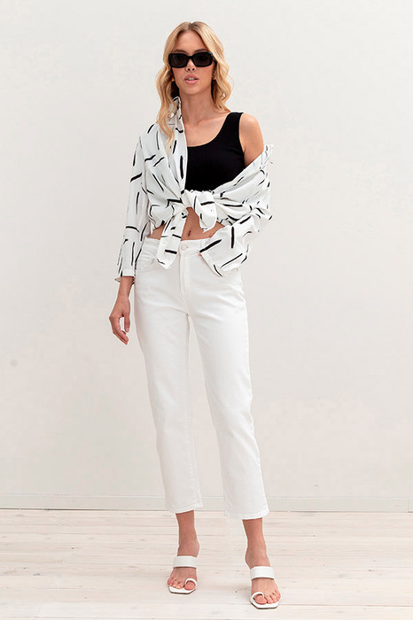 Брюки из эластичного денима, чуть зауженные книзу. На задней части брюк выполнены накладные карманы, на передней - карманы с подкройным бочком. Притачной пояс со шлёвками. Застёжка на молнию-гульфик и пуговицу.