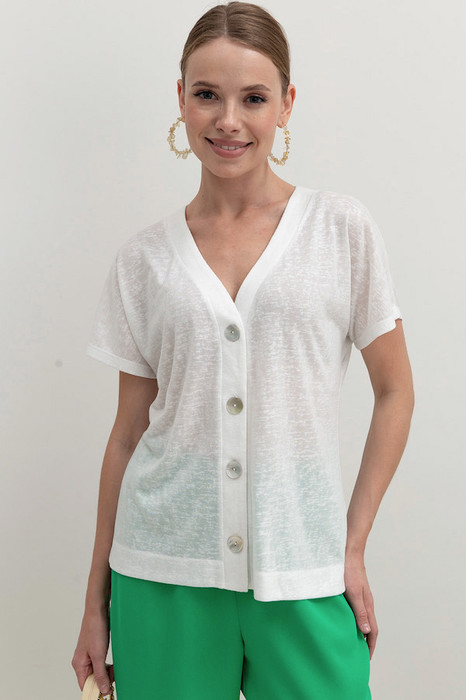 Кардиган свободного силуэта из мягкого эластичного полотна с лёгким мерцающим накатом. Цельнокроеный короткий рукав. Линия борта обработана притачной планкой с застёжкой на пуговицы.
