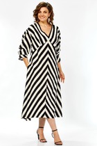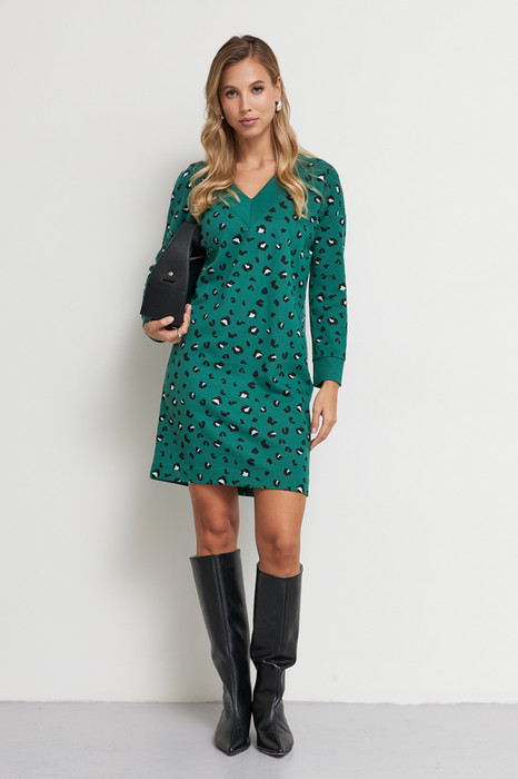 Платье свободного силуэта из эластичного полотна с жаккардовым узором. V-образный вырез горловины обработан притачной планкой. Втачной длинный рукав в спущенную пройму с манжетой. Манжет рукава и планка выполнены из ткани-компаньона.