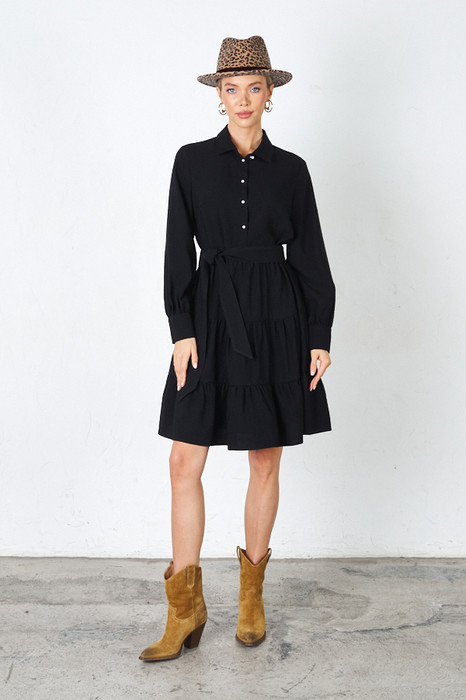 Платье свободного силуэта из вискозной ткани с крэш-эффектом. Изделие отрезное по линии талии, с ярусами на юбке. Лиф с застёжкой на пуговицы. Вырез горловины обработан отложным воротником на стойке. Втачной рукав на манжете с застёжкой на пуговицы. В комплекте пояс из основной ткани. В таблице размеров представлены параметры человека, а не изделия.