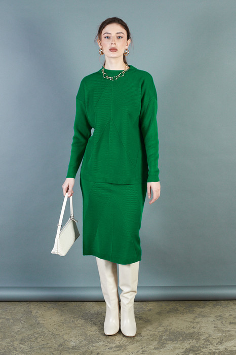 Костюм из джемпера и юбки с фактурным рисунком. Юбка прилегающего силуэта. Пояс с эластичной резиной. Джемпер свободного силуэта. Рукав втачной в спущенную пройму. Вырез горловины оформлен резинкой. Изделие выполнено из мягкой структурированной пряжи.