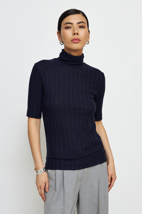 Джемпер прилегающего силуэта из фактурного эластичного полотна. Втачной короткий рукав. Вырез горловины высокая стойка. Джемпер – это хорошая базовая вещь, подходящая для любого гардероба.