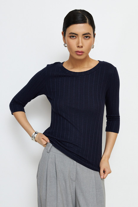 Джемпер прилегающего силуэта из фактурного эластичного полотна. Втачной рукав 3/4. Круглый вырез горловины оформлен бейкой.
