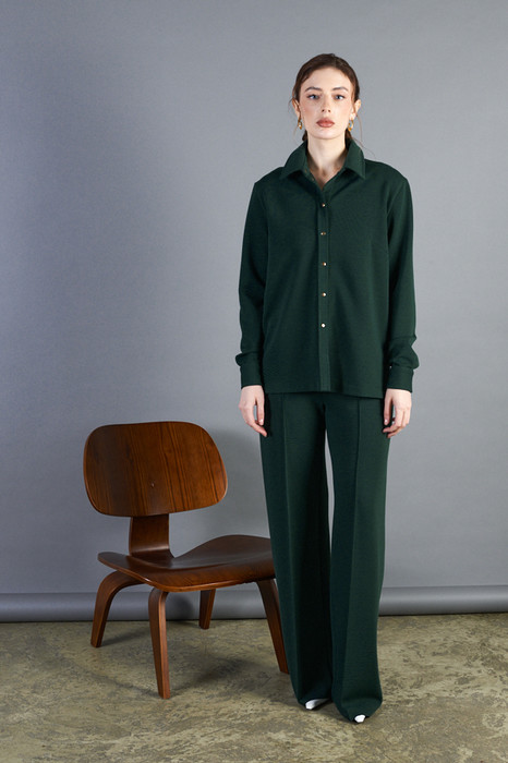 Брюки выполнены из эластичного полотна. Брюки прямого силуэта. Пояс притачной с эластичной резиной. На передней части брюк застрочены стрелки.