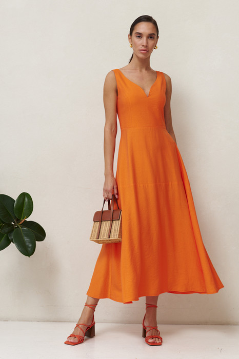 Платье на бретелях, отрезное по линии талии из вискозной ткани с крэш-эффектом. Изделие, прилегающее в области груди и свободное в области бедер. Нижняя часть платья по силуэту колокол с кокеткой. Лиф двухслойный с красивым женственным вырезом и рельефными швами от проймы. По среднему шву спинки застежка-молния.