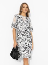 Платье на бретелях, отрезное по линии талии из вискозной ткани с крэш-эффектом. Изделие, прилегающее в области груди и свободное в области бедер. Нижняя часть платья по силуэту колокол с кокеткой. Лиф двухслойный с красивым женственным вырезом и рельефными швами от проймы. По среднему шву спинки застежка-молния.