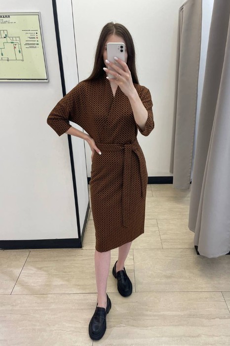 Платье из эластичного полотна. Изделие свободное в верхней части и прилегающее в области талии и бёдер. Лиф изделия оригинального кроя в стиле кимоно. Цельнокроеная стойка переходящая в запах, визуально делает фигуру стройнее. По центру задней части платья выполнен шов, снизу небольшой разрез. В комплекте пояс. В таблице размеров представлены параметры человека, а не изделия.
