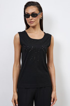 Укороченный топ на лямках из эластичного полотна в рубчик. Прилегающий силуэт. Круглый вырез горловины и линия проймы оформлены бейками.
