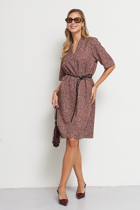 Платье свободного силуэта из плательной ткани. По центру передней части изделия выполнен шов. Цельнокроеная стойка, переходящая в V-образный вырез горловины, визуально делает фигуру стройнее. Втачной короткий рукав.