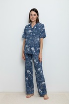 Брюки, зауженные в области колена и расклешённые книзу из эластичного полотна, с покрытием, имитирующим кожу. На задней части брюк по талии выполнены две вытачки. На передней части застрочены стрелки. Брюки без пояса на обтачке. В боковом шве потайная молния.