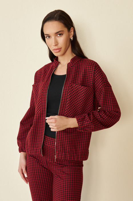 Жакет-бомбер выполнен из эластичного полотна с жаккардовым узором "клетка". Свободный силуэт с застёжкой-молнией и накладными карманами. Рукав втачной в спущенную пройму. Нижняя часть рукава и низ изделия присборены на резинку. Линия горловины оформлена воротником-стойкой.