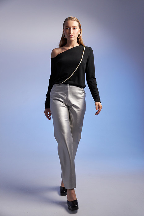 Брюки из эластичного полотна, с покрытием, имитирующим кожу, зауженные книзу. На передней части брюк карманы с подкройным бочком. Притачной пояс, застёжка на металлическую молнию-гульфик и кнопку.