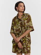 Блуза из вискозной ткани с сатиновым блеском. Свободный силуэт с разрезами в боковых швах и застёжкой на пуговицы. На задней части изделия выполнена кокетка с небольшой складкой. Вырез горловины обработан отложным воротником на стойке. Втачной рукав на манжете с застёжкой на пуговицы. Изделие украшено съемной планкой с перьями. Перед стиркой планку с перьями необходимо снять.