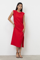 Платье очень свободного силуэта из вискозной плательной ткани. Изделие отрезное по линии талии, с ярусами на юбке. Линия талия завышена. Втачной длинный рукав. Круглый вырез горловины, сзади застёжка на петлю-пуговицу. Низ изделия асимметричной длины (спинка удлинена относительно переда). В таблице размеров представлены параметры человека, а не изделия.