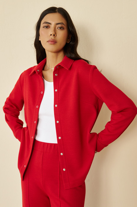 Жакет выполнен из эластичного полотна. Изделие в рубашечном стиле. Свободный силуэт с разрезами в боковых швах и застёжкой на планке. Вырез горловины обработан отложным воротником на стойке. Втачной рукав на манжете с застёжкой на кнопки.