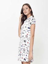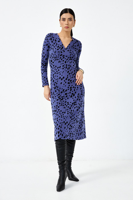 Платье полуприлегающего силуэта, расширенное книзу из эластичного полотна с жаккардовым узором. Боковые швы смещены в сторону переда. На передней части, ниже линии груди, выполнены рельефы. Линия рельефа начинается от выреза горловины и заканчивается в боковом шве на уровне выше линии талии. V- образный вырез горловины. Спинка со средним швом и талиевыми вытачками. Втачной длинный рукав.