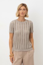 Джемпер свободного силуэта с вышивкой в области груди. Рукав втачной в спущенную пройму. Низ изделия и низ рукава оформлены резинкой, воротник-стойка с отворотом. Изделие выполнено из меланжевой пряжи.