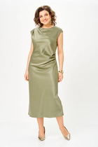 Платье свободного силуэта выполнено из эластичного полотна с жаккардовым узором. Изделие со спущенной линией плеча и рукавом до локтя. Вырез горловины оформлен бейкой из основной ткани. В таблице размеров представлены параметры человека, а не изделия.