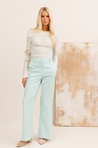 Брюки прямого силуэта из костюмной ткани. Пояс притачной с эластичной резиной.