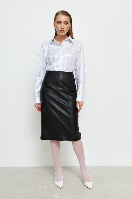 Юбка прилегающего силуэта из эластичного полотна, с покрытием, имитирующим кожу. По центру передней и задней части изделия выполнены швы, на передней части шов с декоративной строчкой. Сзади по среднему шву застёжка-молния, снизу шлица с разрезом. Изделие без пояса, верхний срез обработан обтачкой. На передней и задней половине юбки выполнены талиевые вытачки с декоративной строчкой.